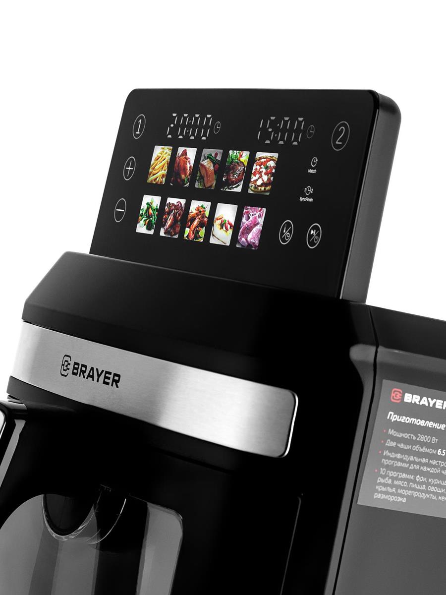 Объем верхней чаши 6,5 л. Объем нижней чаши 6,5 л. 0 программ: фри, курица, рыба, мясо, пицца, овощи, крылья, морепродукты, кекс, разморозка