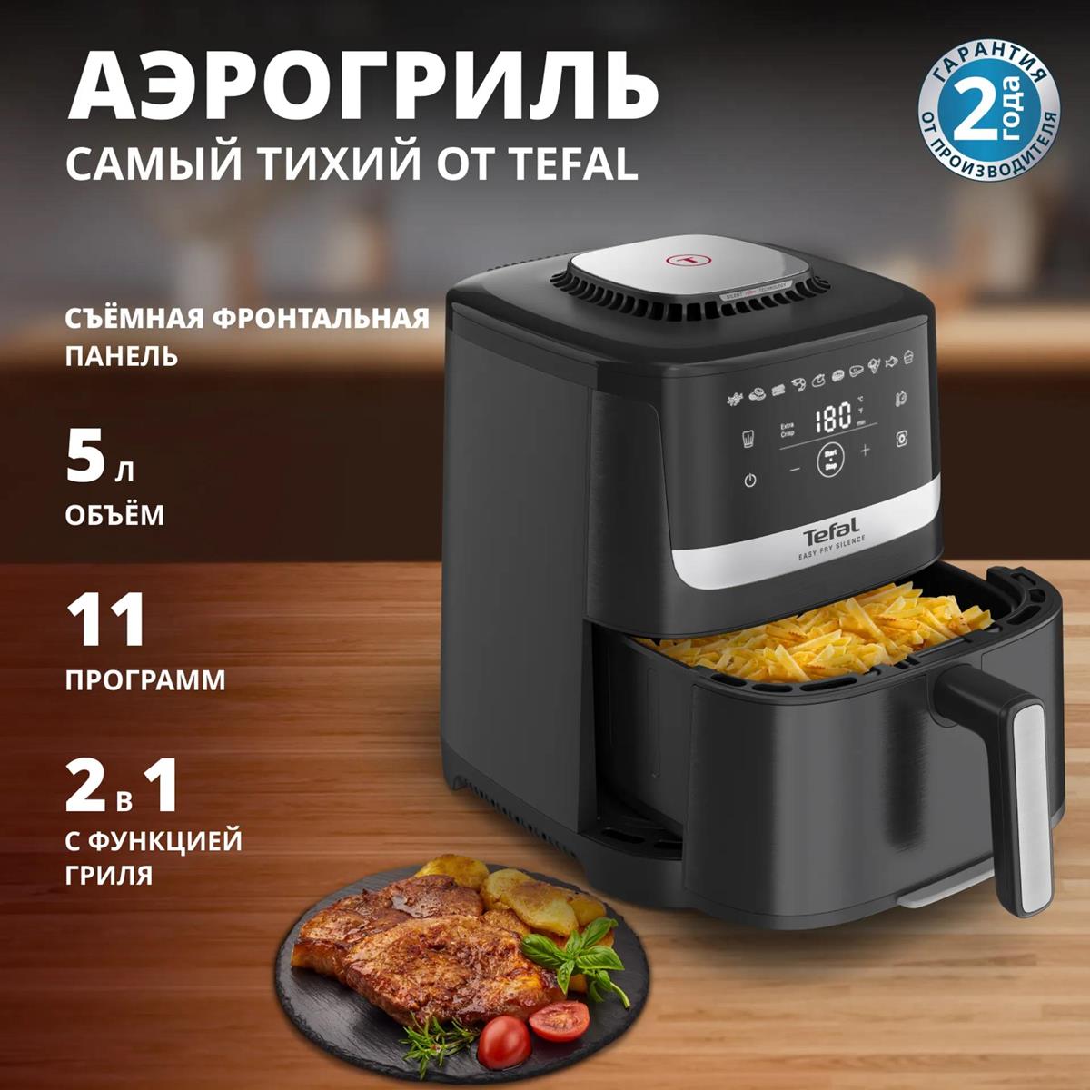 Аэрогриль Tefal Easy Fry Silence EY5528E0 открывает совершенно новый уровень домашнего приготовления — тихий, мощный и удивительно удобный. Продуманная конструкция и объёмная чаша на 5 литров позволяют готовить от 2 до 4 порций за один раз, превращая ежедневные блюда в маленькие кулинарные победы. Компактный корпус легко вписывается в интерьер кухни, а съёмная фронтальная панель делает уход за устройством интуитивно простым и быстрым. Модель оснащена 11 программами, включая функцию Extra Crisp, которая создаёт более хрустящую корочку благодаря интенсивному воздушному потоку на максимальной мощности. Аэрогриль работает почти бесшумно — всего около 48 дБ — благодаря фирменной технологии Silent Technology, которая делает его самым тихим аэрогрилем Tefal. Теперь можно готовить поздним вечером, не тревожа спящих домочадцев. Чаша легко помещается в раковину и посудомоечную машину, а благодаря крышке из комплекта в ней можно хранить еду прямо в холодильнике. Решётка из литого алюминия позволяет готовить блюда «как на гриле», а сенсорная панель управления делает выбор программы точным и удобным.