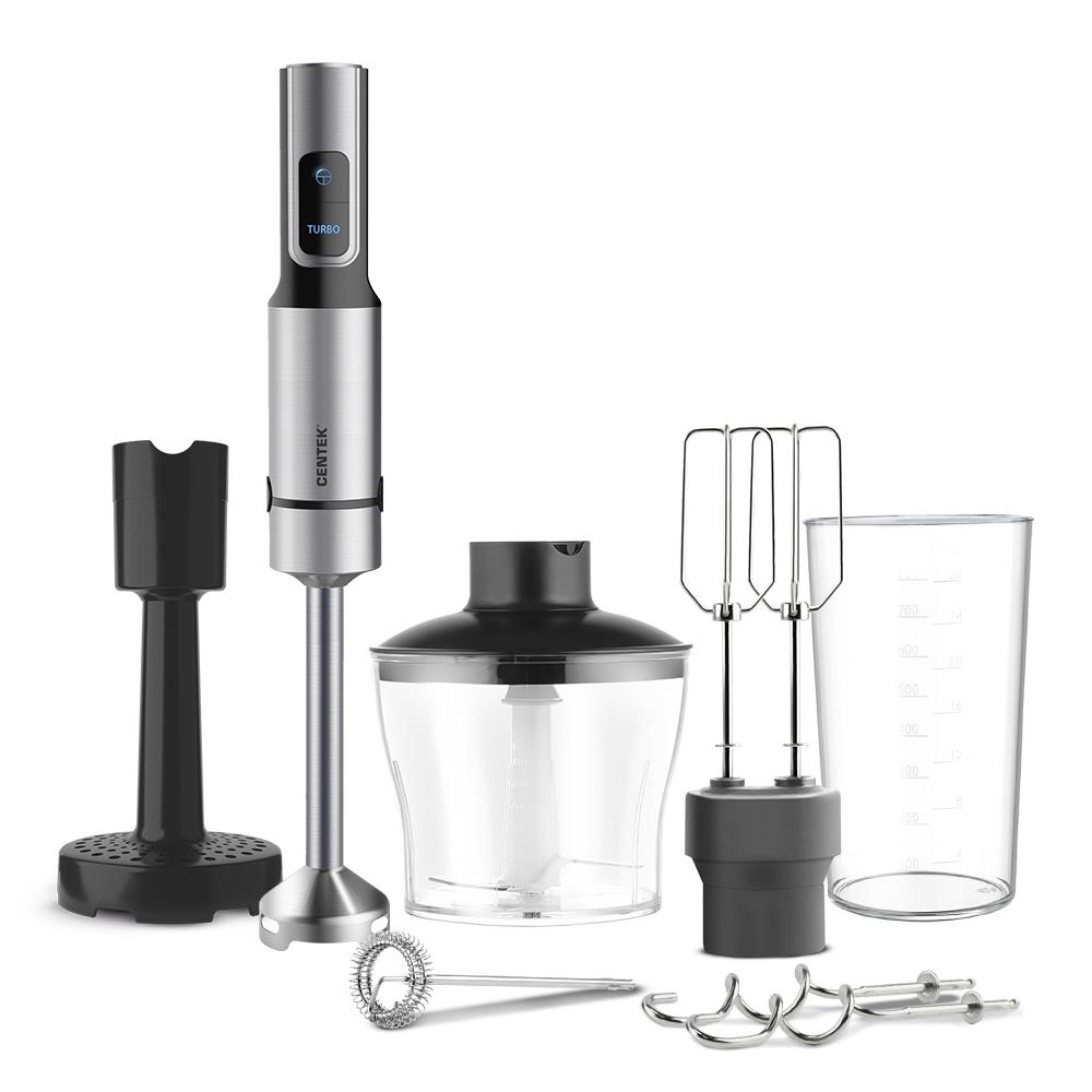 Блендер Centek CT-1312 – это многофункциональный качественный прибор, позволяющий смешать или измельчить продукты в считаные секунды. Погружной блендер с острыми ножами из нержавеющей стали обеспечит однородную текстуру без комочков. В комплект также входят насадки для взбивания и замешивания теста, чоппер для шинковки и измельчения объемом 650 мл, насадка для приготовления пюре, капучинатор для взбивания молока и мерный стакан объемом 800 мл. Прибор отличается надежностью материалов: корпус и ножка прибора сделаны из высококачественной нержавеющей стали. Для вашего комфорта предусмотрены удобные крепления-замочки, которые дают возможность быстро менять насадки. Форма рукоятки адаптирована под кисть руки.