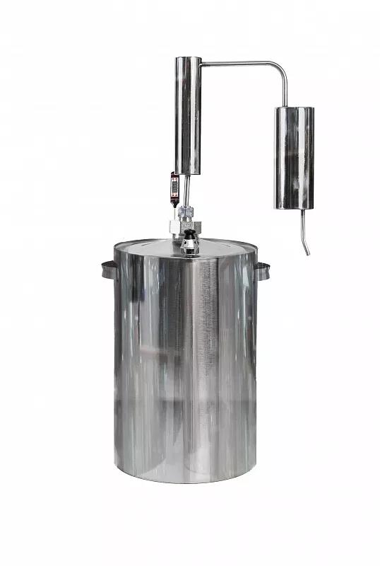 Дистиллятор – устройство для домашнего использования, все компоненты которого произведены из высококачественных материалов. Модели необходим всего час, чтобы осуществить переработку двух литров жидкости. Основной бак устройства вмещает не менее 20 литров жидкости, которая отправляется в гофрированный шланг-охладитель для последующей конденсации. Благодаря встроенному термометру и клапану Вы сможете контролировать уровень давления в данном дистилляторе. Для нагревания устройства сгодится любой внешний источник – подойдет даже стандартная газовая плита. Основная емкость модели произведена из качественной стали, а в ходе изготовления стыков устройства использовалась аргоновая сварка, благодаря которой дистиллятор не подвержен коррозии.