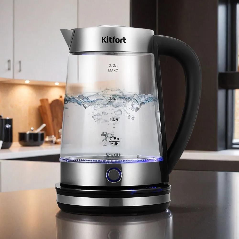 Электрический чайник Kitfort КТ-6764 (1800 Вт/2,2 л /стекло, нержавеющая сталь/прозрачный, черный, серебристый) - Интернет-магазин ОЛИМП: бытовая техника, электроника, товары для дома и др.