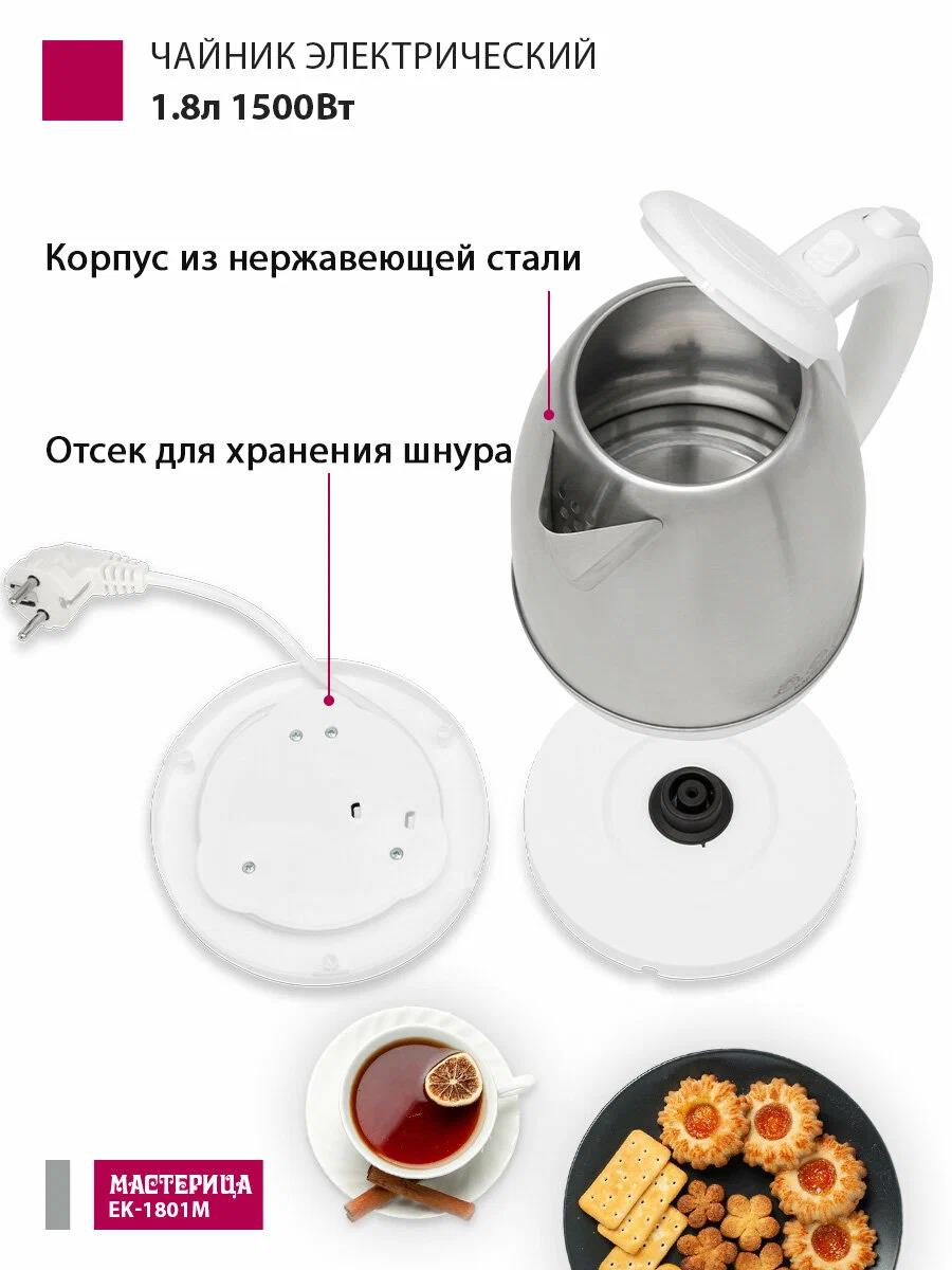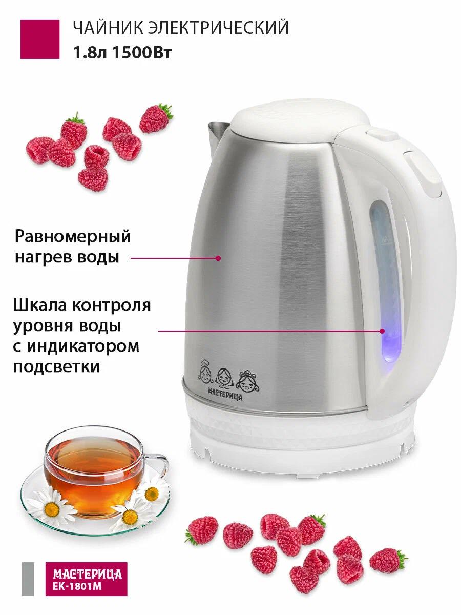 Электрический чайник Мастерица EK-1801М (1500 Вт/1,8 л /металл, пластик/белый, нержавеющая сталь) - Интернет-магазин ОЛИМП: бытовая техника, электроника, товары для дома и др.