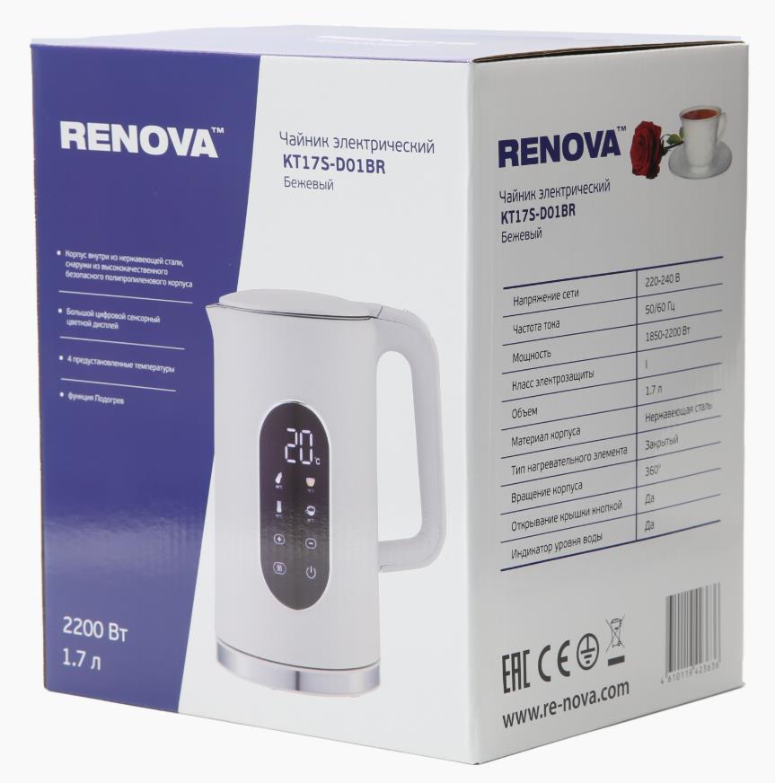 Электрический чайник Renova KT17S-D01BR (2200 Вт/1,7 л /пластик, нержавеющая сталь/белый)