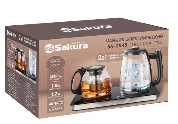 Чайник электрический 2-в-1 с заварочным чайником. Электрический чайник: 1,8 л, стеклянный корпус, подсветка, отключение при закипании и включении без воды. Заварочный чайник: 1,2 л, корпус из стекла, фильтр из нержавеющей стали, поддержание температуры (40-60⁰С, настройка с шагом 5⁰С). Общая мощность: 1500-1800 Вт. Установка на базу из закаленного стекла.