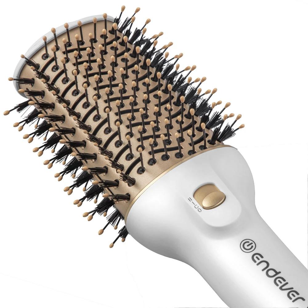 Фен-щетка имеет два регулируемых режима нагрева подаваемого воздуха для более качественной укладки, а режим подачи холодного воздуха позволит Вам быстрее зафиксировать её. К тому же новая комбинированная щетка не даст Вашим волосам спутаться, а специальное керамическое покрытие защитит Ваши волосы от повреждений. Endever Aurora-500 оснащен безопасным наконечником для безопасного использования стайлера. так же у нашей фен-щетки установлено специальное шарнирное соединения для вращения шнура на 360 градусов, чтобы он не запутывался во время использования стайлера, а также на шнуре есть специальная петелька, благодаря которой Вы легко сможете разместить прибор в ванной комнате или любом другом помещении.