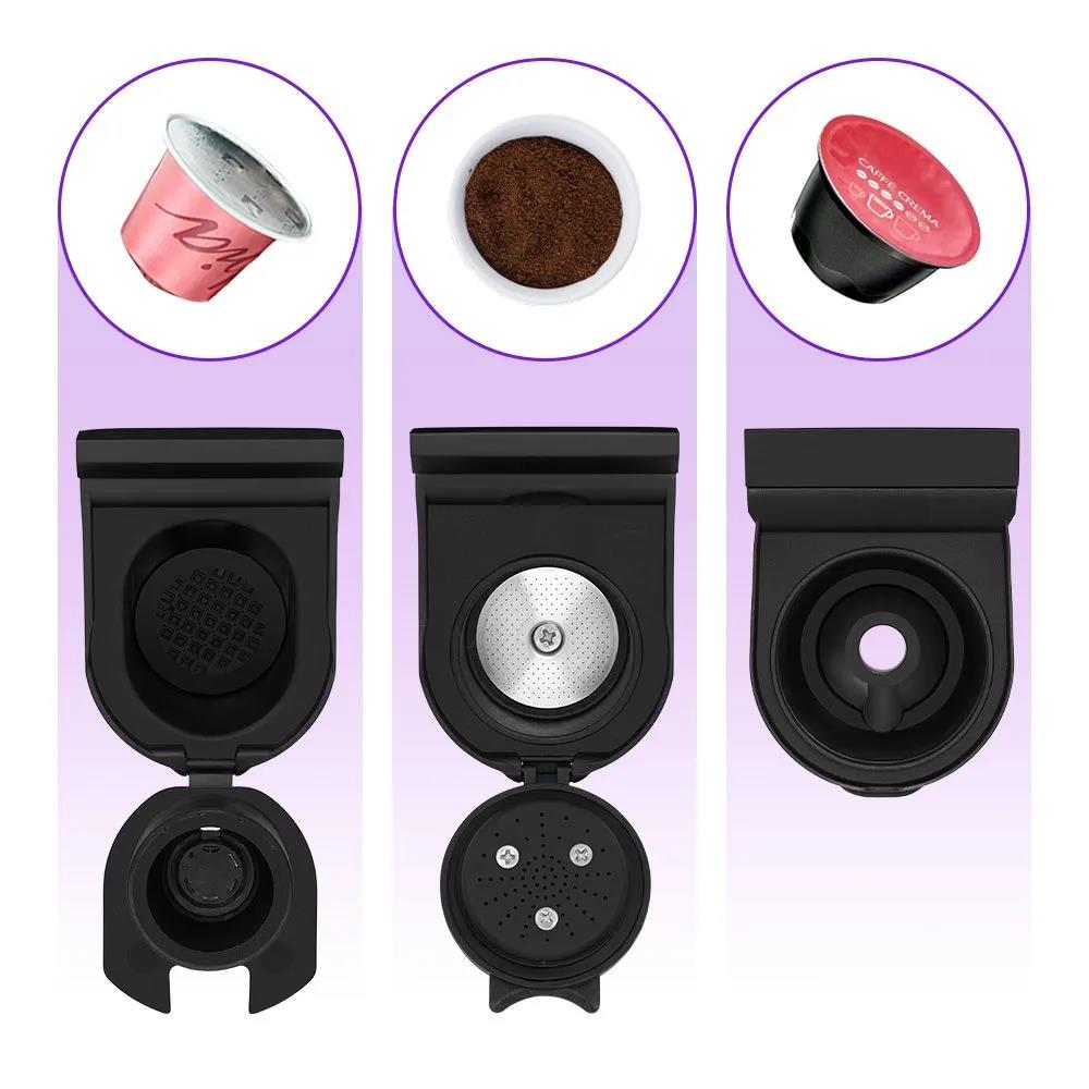 Кофеварка «3 в 1» КТ-7462 – многофункциональное устройство, сочетающее в себе функции капсульной и рожковой кофеварок. Благодаря адаптерам кофеварка подходит для капсул типа Nespresso Original и Dolce Gusto, а также для молотого кофе.