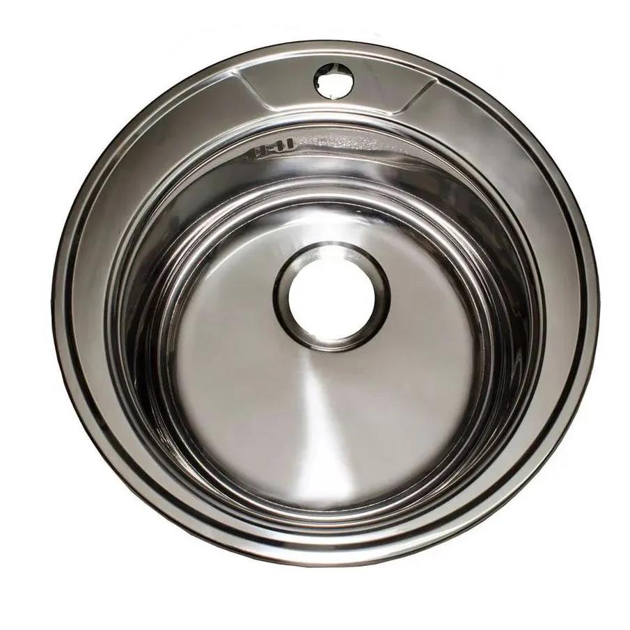 Врезная круглая мойка из высококачественной нержавеющей стали. Этот материал удобен в уходе, выдерживает кипяток, исключает трещины и расколы. Данная модель подходит под большой сифон с переливом. На поверхности мойки имеется отверстие для смесителя. Универсальный размер раковины идеально подойдет для большинства тумб и для любого интерьера комнаты.