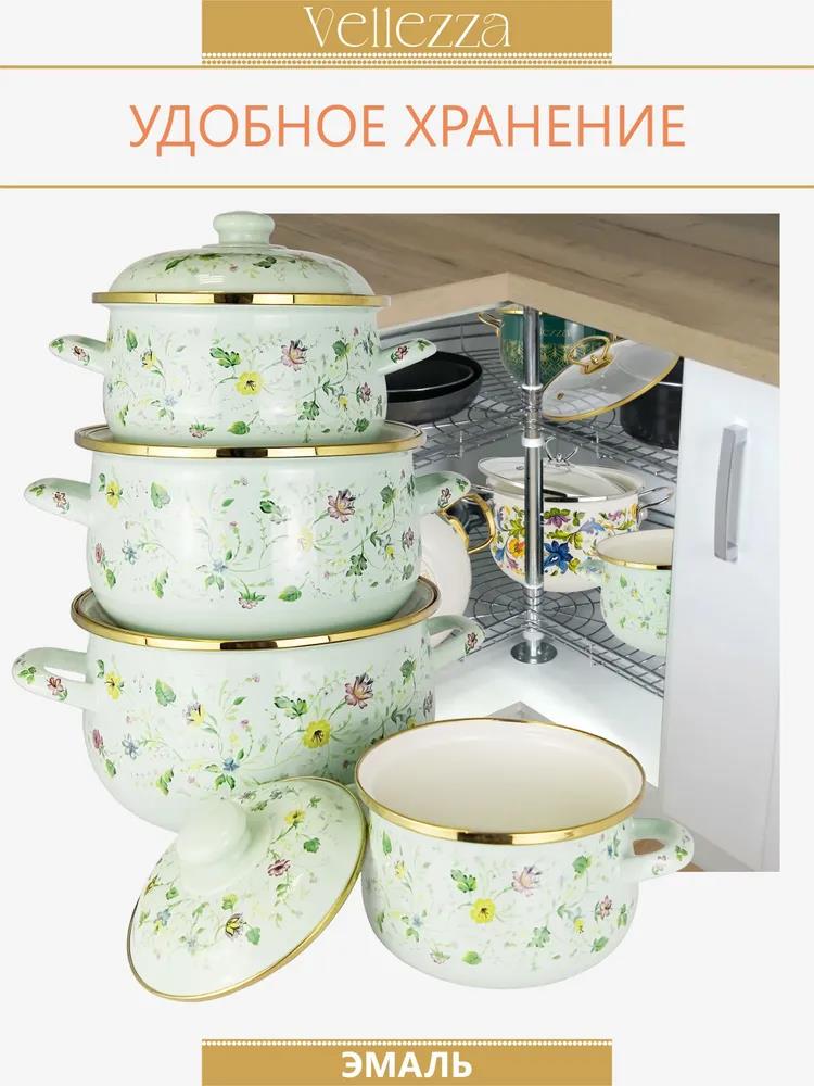 8 предметов: 4 эмалированные кастрюли 4 эмалированные крышки Размеры: Ø 16 | h-10.3 см | 1.5 л Ø 20 | h-13.0 см | 3.0 л Ø 24 | h-15.0 см | 5.5 л Ø 26 | h-16.0 см | 6.5 л
