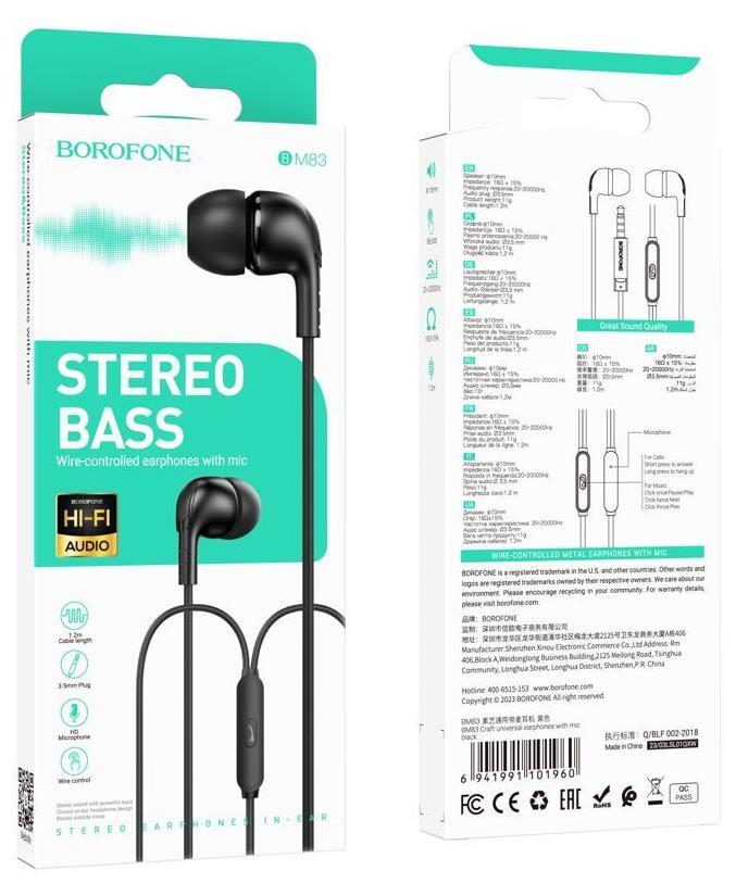 Borofone BM83 - универсальные наушники с микрофоном, аудио штекером 3.5мм и кабелем длиной 1.2м. Вакуумные наушники с отличным звуком для комфортного прослушивания музыки. Эргономичные, легкие и удобные в использовании. Обеспечивают отличное качество звучания и максимальную степень комфорта.