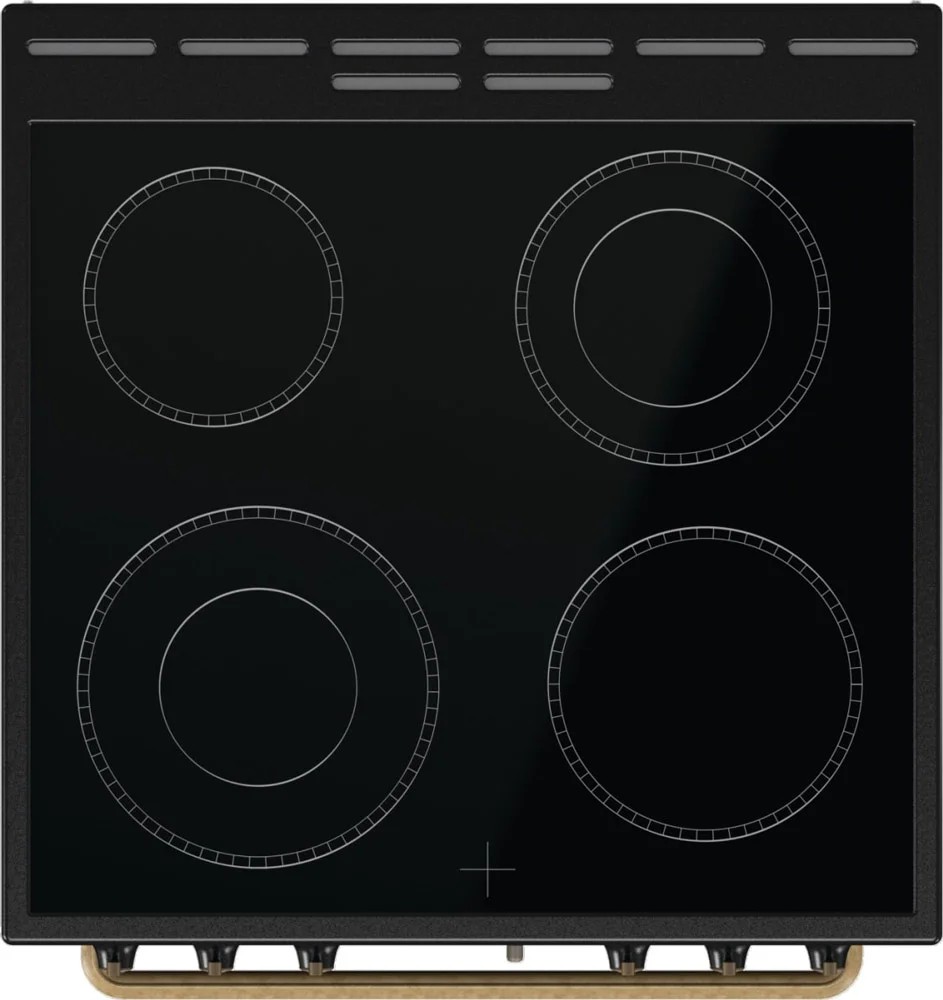 Электрическая плита Gorenje GECS6B70CLB элегантного черного цвета органично дополнит современную или классическую кухню. Она выполнена в ретро дизайне и станет не только функциональным прибором, но и настоящим украшением интерьера. Переключатели бронзового цвета подчеркивают общее оформление. Ручки эргономичные. Вы легко сможете отрегулировать нагрев. Варочная поверхность стеклокерамическая. Ее можно мыть мягкими чистящими средствами. Часы с аналоговым циферблатом помогут вам контролировать время готовки. Можно настроить таймер. Установите нужное время, сигнал напомнит вам о том, что прибор пора выключить. Общее количество конфорок — четыре. Две из них двухконтурные. Благодаря этому вы можете использовать посуду разного размера.