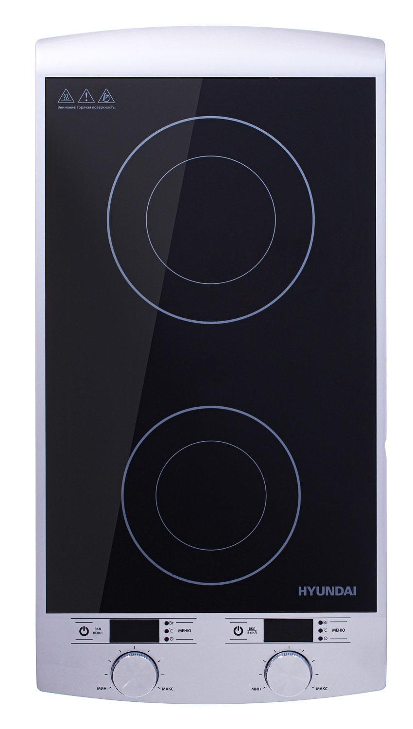Плитка индукционная Hyundai HYC-0103 с двумя конфорками и максимальной мощностью 2,9 кВт стильно выглядит, быстро разогревает, готовит первые и вторые блюда, помещенные в стальную либо чугунную посуду с ровным дном. Малогабаритная рабочая область потребляет не более 1,3 кВт, а крупноразмерная конфорка расходует до 1,6 кВт энергии. Всего имеется десять температурных уровней. Встроенный электронный таймер избавляет пользователя от постоянного нахождения возле плиты, поскольку позволяет выбирать время приготовления пищи в диапазоне от 1 минуты до 3 часов. Панель управления содержит цифровой экран, индикаторы, пару кнопок, а также ручку настройки мощности.
