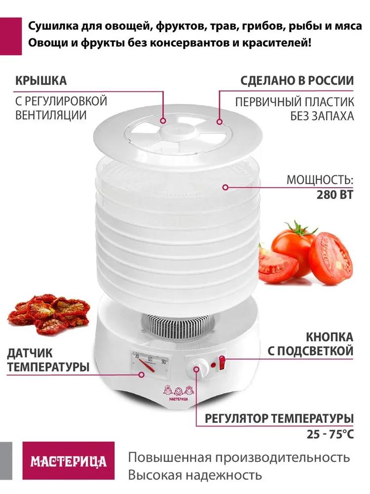 Сушилка для овощей и фруктов Мастерица EFD-0602VM 6 белых поддонов + 2 прозрачных поддона + поддон для пастилы в подарок. Мощность 280Вт Биметаллический термометр показывает температуру сушки. Крышка с регулировкой вентиляционных отверстий, регулятор температуры от 25 до 75 градусов Световой индикатор работы