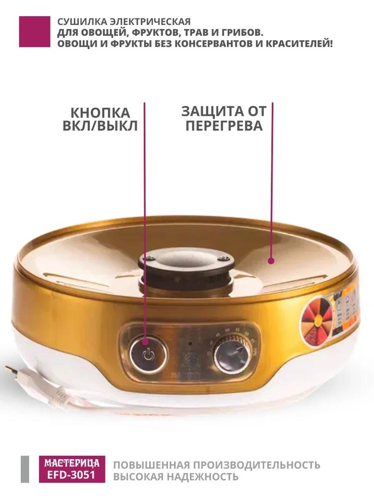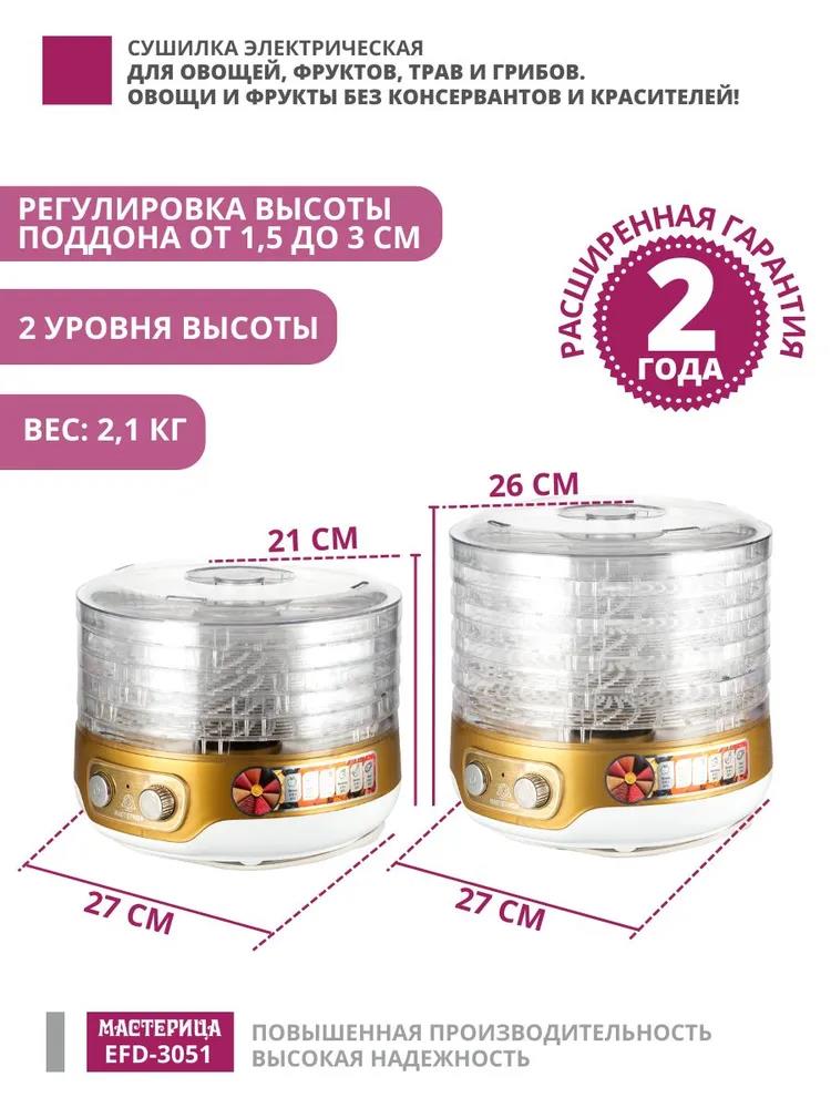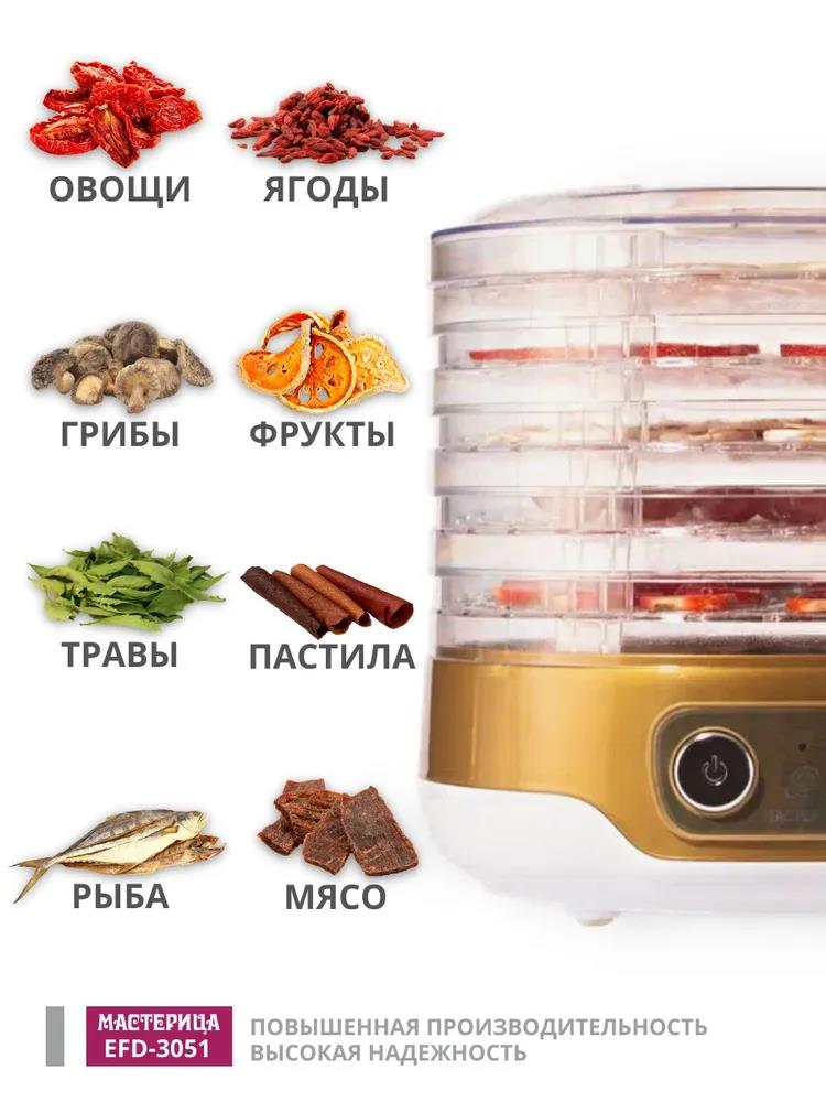 Сушилка для овощей Мастерица EFD-3051, 5 поддонов + 1 поддон д/пастилы в подаро, D 26 см (поддонов 5 шт, 250 Вт , белый, золотистый) - Интернет-магазин ОЛИМП: бытовая техника, электроника, товары для дома и др.