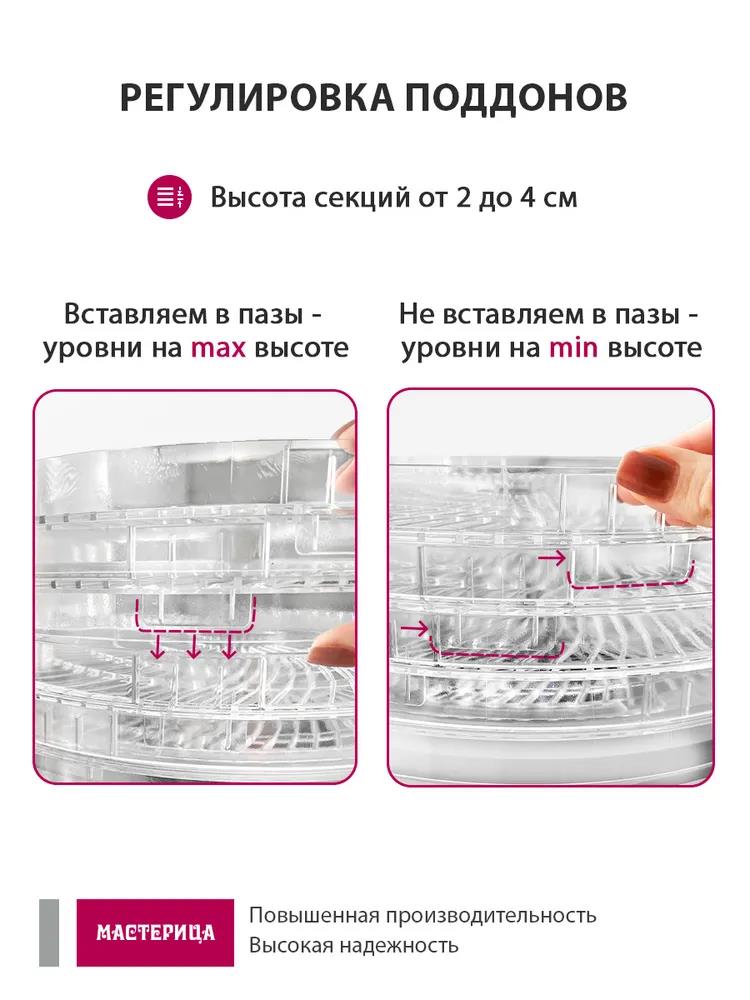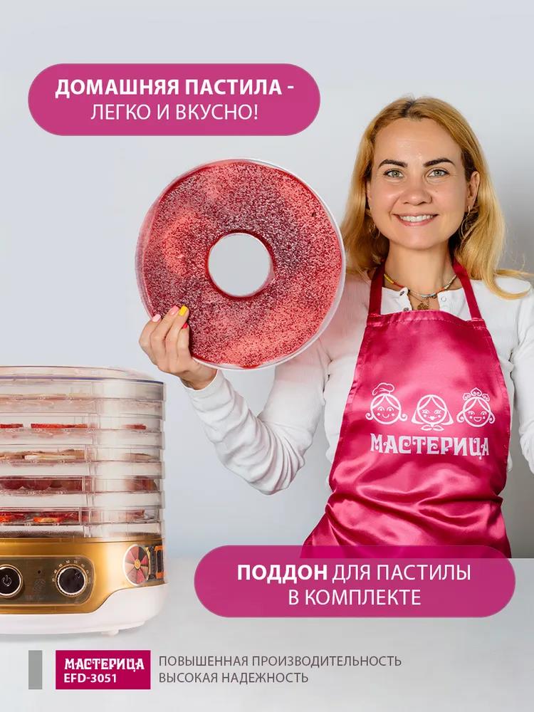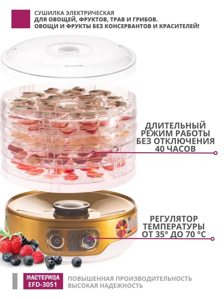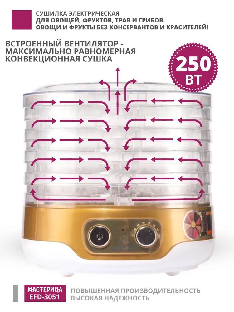 Сушилка для овощей Мастерица EFD-3051, 5 поддонов + 1 поддон д/пастилы в подаро, D 26 см (поддонов 5 шт, 250 Вт , белый, золотистый)