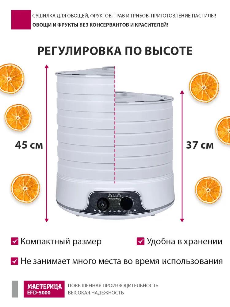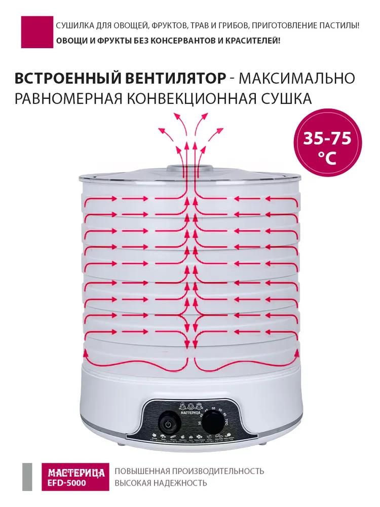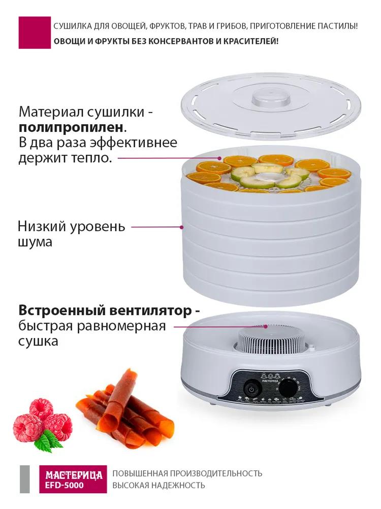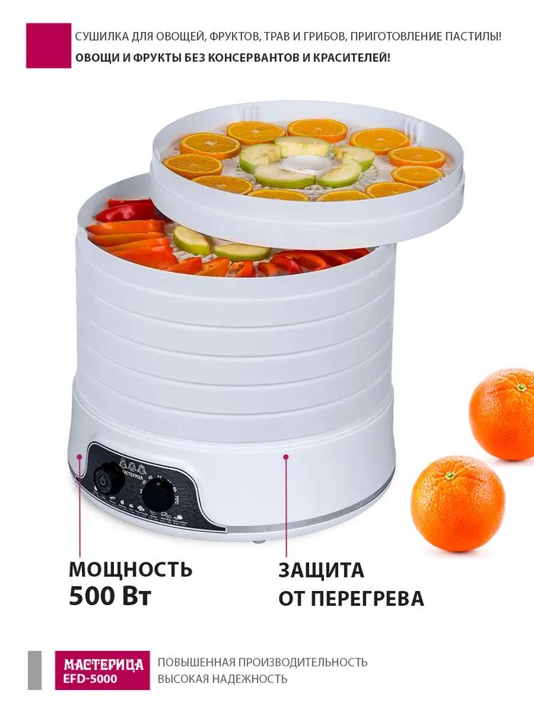 Сушилка для овощей Мастерица EFD-5000, 6 белых поддонов + 3 поддона д/пастилы 500Вт, увеличенный D поддона 36 см (поддонов 6 шт, 500 Вт , белый)