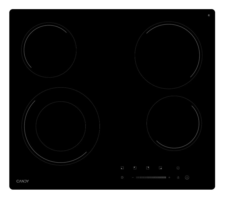 Candy CHXC64DB — это независимая электрическая варочная панель из стеклокерамики с четырьмя конфорками типа Hi-Light. Модель отличается наличием сенсорного управления со слайдером для удобной регулировки мощности и радиальной зоной расширения на одной из конфорок.