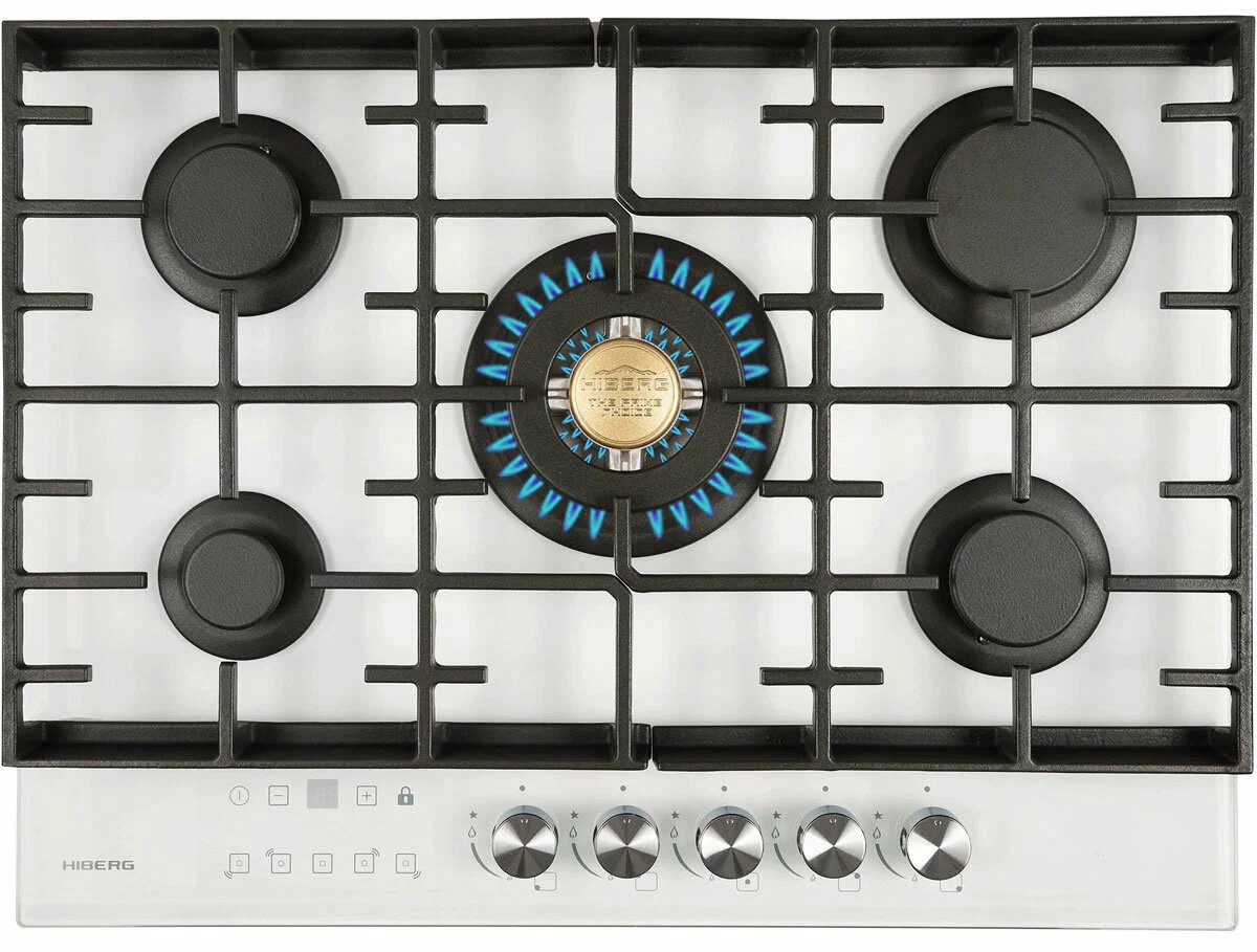 Встраиваемая газовая варочная поверхность HIBERG VM 7155 W из закаленного стекла в белом цвете, оснащена 5 конфорками и функциями: автоматический «электророзжиг», «газ-контроль» и сенсорный таймер отключения газа.