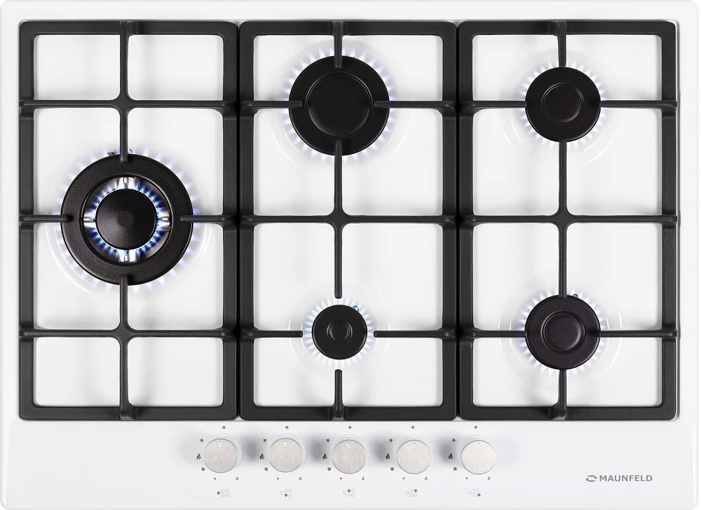 Maunfeld EGHE.75.33CW/G — это пятиконфорочная газовая варочная панель шириной 70 см. Управление механическое, осуществляется при помощи цельнометаллических поворотных ручек серебристого цвета. Решётки чугунные. Функция газ-контроля обеспечивает безопасную эксплуатацию.